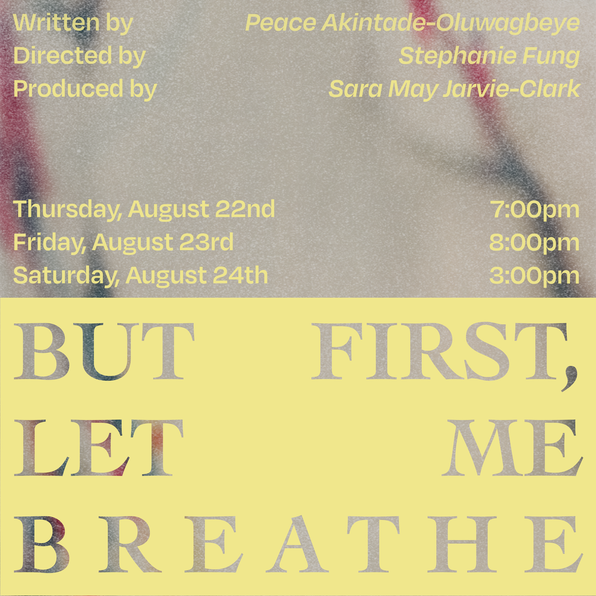 “But First, Let Me Breathe” is a dramedy, with poetry, about the untold, de-glamorized side of being in a melting pot. What happens when the intersections of race, culture, and language become too much? What happens when you are stuck for four years with the same people? Do we create our own individualism, or is it inherited by society's perspective? What happen if the We vs Them debate was given steroids? Ash, Bev, Cue, and Dee must create a show to make their communities proud, but betrayal, love, and ignorance keep getting in the way.